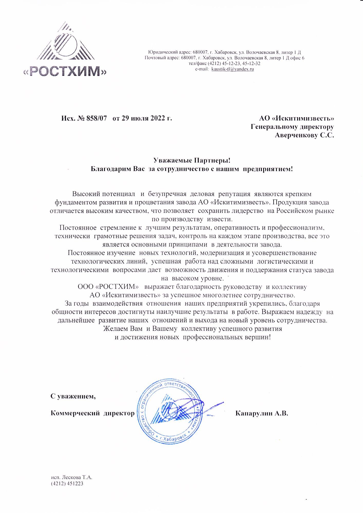 ООО «Ростхим» выражает благодарность руководству и коллективу АО «Искитимизвесть» за успешное многолетнее сотрудничество.